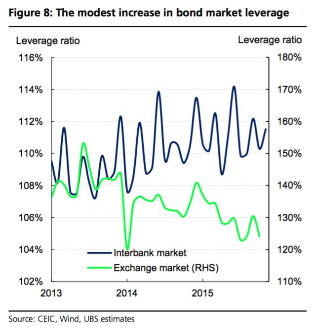 另一方面,據瑞銀測算,銀行間債市的杠桿率小幅上升,交易所債市杠桿經歷過快速走高后出現回落。