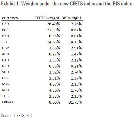 高盛提示到,CFETS指數由13種貨幣按對中國的貿易重要性加權構成,其中剔除了再出口的影響。該指數中,美元和歐元的權重要顯著高于國際清算銀行(BIS)的中國有效匯率。美元、歐元、日元、英鎊和港元五種主要貨幣權重在CFETS指數中占到73%,對應BIS的指數中只占到54%。