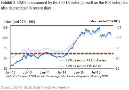 高盛并不認為人民幣匯價被明顯高估,該行預計2016年在岸人民幣僅會小幅下跌至6.6水平,較目前位置還有2.4%的貶值空間